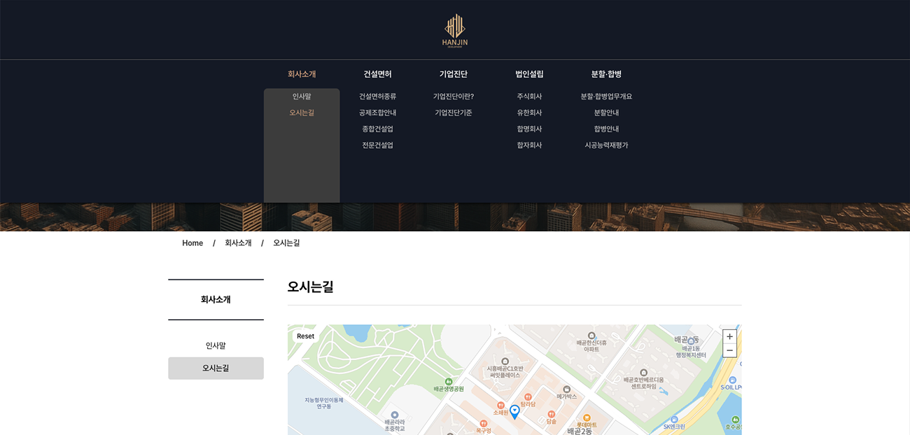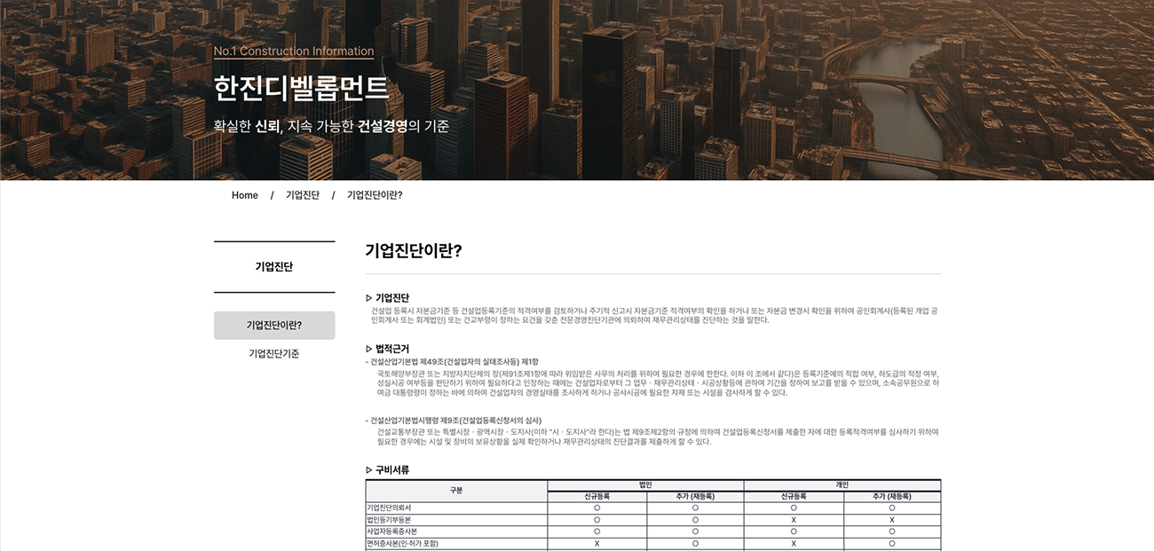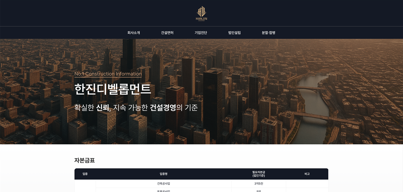 한진디벨롭먼트 웹사이트는 법인설립, 연말자본금, 기업진단, 면허 양도양수 등 건설 경영 컨설팅 서비스를 체계적으로 소개하는 기업 사이트입니다. 서비스 성격에 맞춰 신뢰감 있는 톤과 명확한 정보 구조를 중심으로 구성했고, 방문자가 필요한 업무를 빠르게 찾고 상담으로 이어질 수 있도록 정리했습니다.