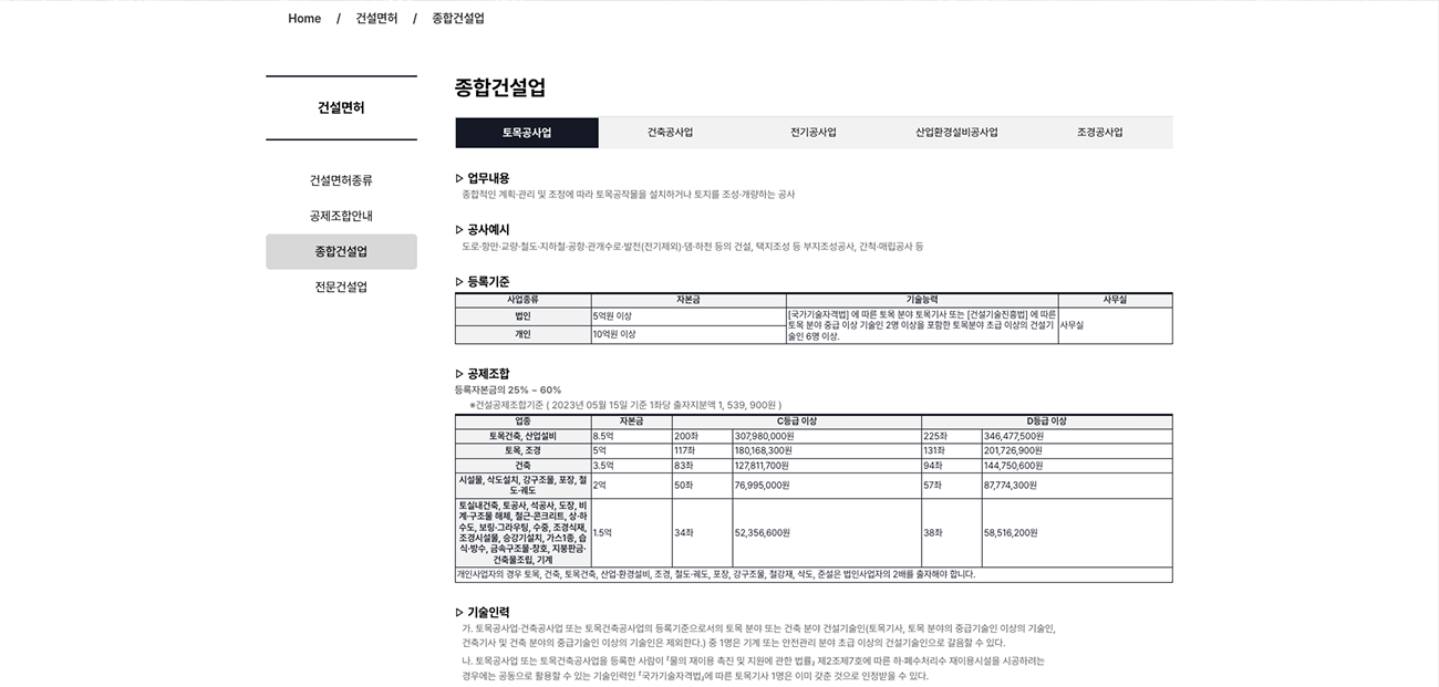 건설 경영 컨설팅 서비스를 소개하는 기업 웹사이트